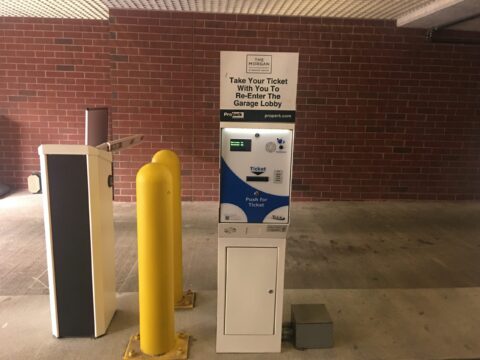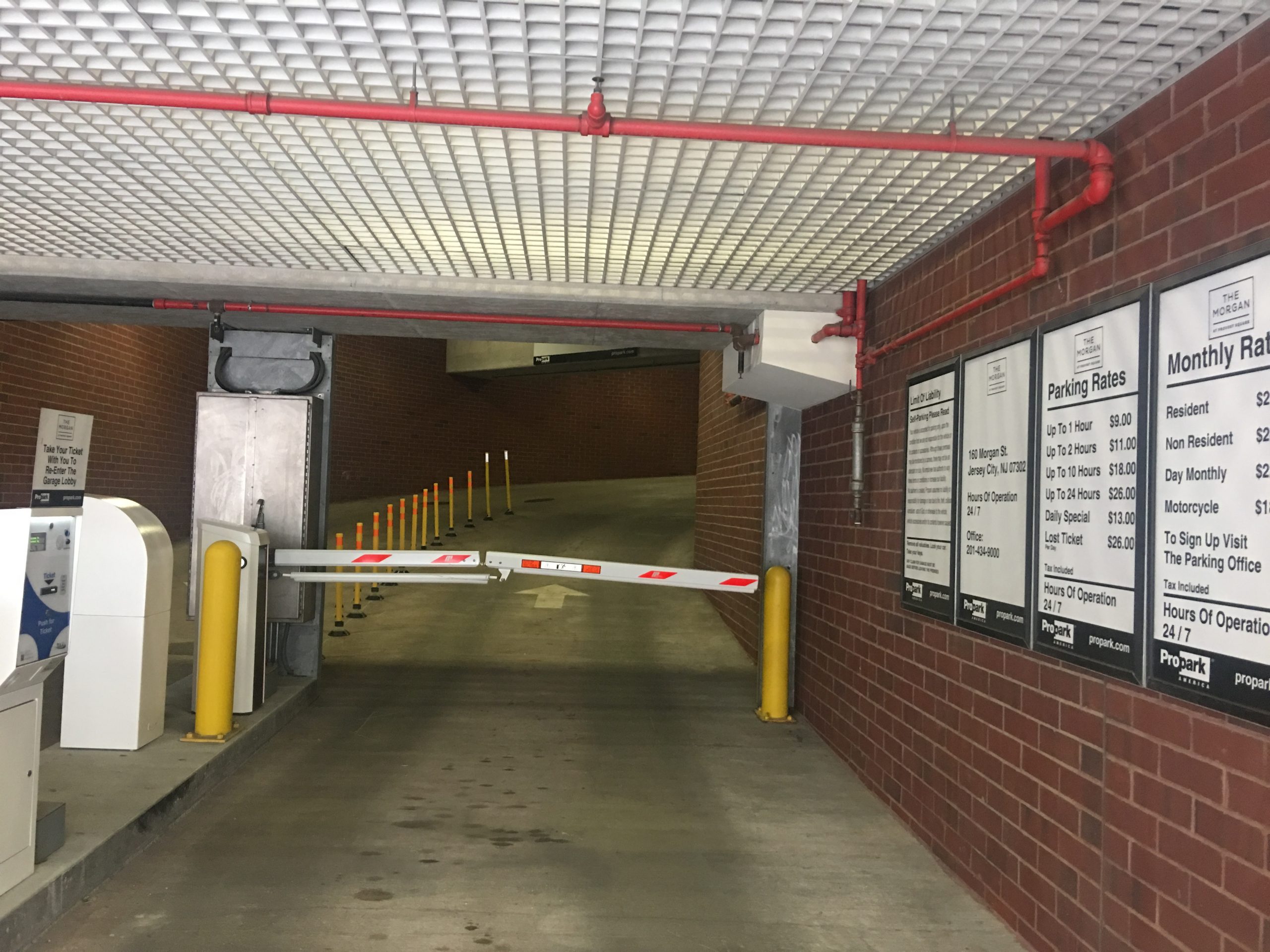 This indoor garage is located on the north side of Morgan Street. It is near the northeast intersection of Marin Blvd. Look for a brown brick building with a gray overhead board reading “Parking” in white lettering.