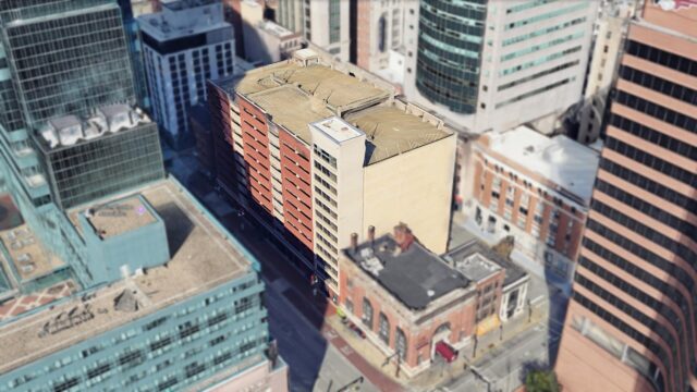 This garage has two entrances, one on Lombard Street between Calvert and South Street, and the other on Water Street between Calvert and South Street.