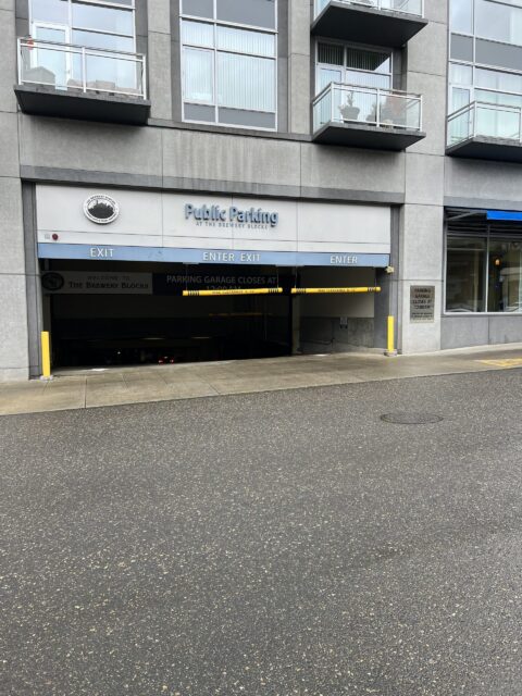 This garage has 2 entrances / exits : 122 NW 12th Ave. & 114 NW 13th Ave. Portland, OR 97209