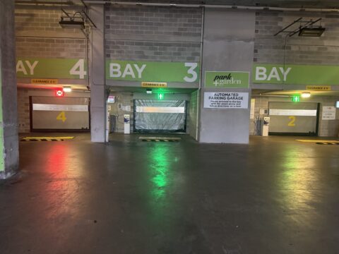 The Park + Garden residential building in Hoboken features a unique, compact U-tron automated parking garage with 314 spaces, which uses robotic shuttles to store vehicles on racks instead of traditional ramps, freeing up space on the ground level for a recreational deck with a pool. This technology allows for increased capacity in a smaller footprint, making the building eco-efficient and more profitable by allowing for more residential units. Propark operates the garage, offering covered parking for both monthly and daily users. This facility is open to the public.