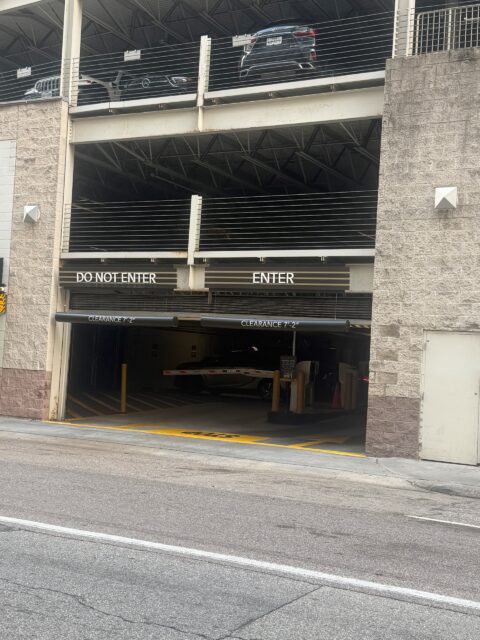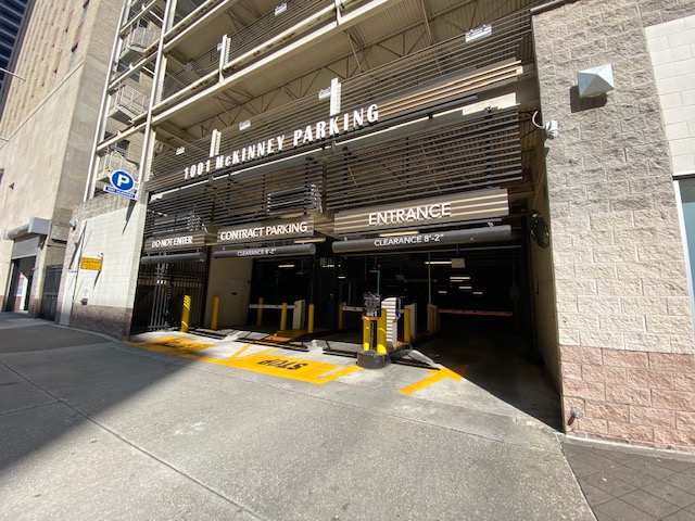 The entrance to this garage is located on the right side of Fannin Street, between Walker Street and McKinney Street. Look for a multi-story garage with a sign that reads “1001 McKinney Parking” in white.